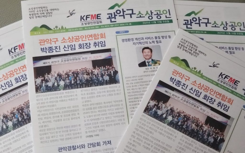 관악구 소상공인연합회(회장 박종진)는 10일 마을신문 ‘관악구 소상공인’ 제6호를 발간했다고 밝혔다. 이번 제6호는 타블로이드판 12면 구성으로 1천부가 제작되어 소상공인 회원을 비롯해 […]