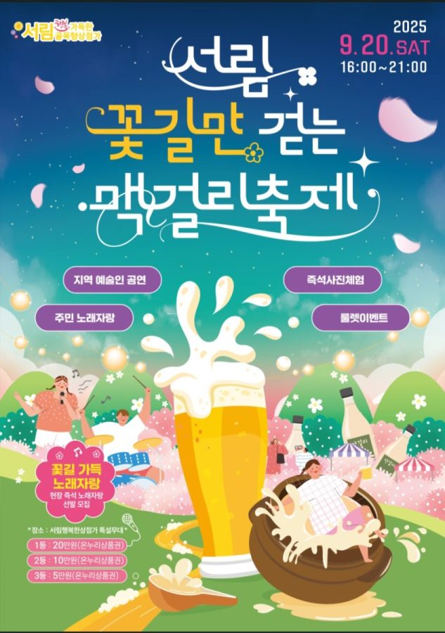 관악구 서림동에서는 오는 9월 20일(토) 오후 4시부터 9시까지 ‘서림 꽃길만 걷는 막걸리 축제’가 열린다. 이번 축제는 서림 행복한 상점가 특설무대에서 진행되며, 주민과 상인, 방문객이 함께 어울리는 지역 대표 축제로 꾸며진다. 행사 프로그램은 ▲지역 예술인 공연 ▲주민 노래자랑 ▲즉석 사진 체험 ▲룰렛 이벤트 등으로 다채롭게 준비된다. 특히 노래자랑은 현장에서 즉석으로 참가자를 모집해 진행되며, 1등(20만 원), 2등(10만 원), 3등(5만 원) 온누리상품권이 시상된다. 축제 현장에서는 막걸리와 함께 꽃길을 거닐며 즐길 수 있는 풍성한 이벤트가 마련돼 남녀노소 누구나 즐거운 시간을 보낼 수 있다. 주최 측은 “가을밤 꽃길과 어우러진 흥겨운 공연과 체험 프로그램 속에서 주민 모두가 함께 즐기고 소통할 수 있기를 바란다”며 많은 참여를 당부했다.