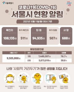 #코로나19 서울시 현황(10.11. 00시 기준) ✔국내 332,816번째 확진자 발생 ✔서울시 확진자 현황: 108,135명(전일대비+511) 🔎서울시 코로나19 통합 사이트: http://seoul.go.kr/coronaV/coronaStatus.do?sns=fb 🔎백신 예방접종 […]