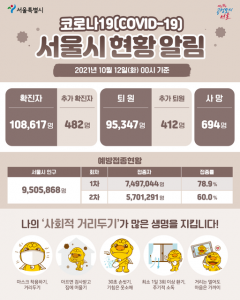 #코로나19 서울시 현황(10.12. 00시 기준) ✔국내 334,163번째 확진자 발생 ✔서울시 확진자 현황: 108,617명(전일대비+482) 🔎서울시 코로나19 통합 사이트: http://seoul.go.kr/coronaV/coronaStatus.do?sns=fb 🔎백신 예방접종 […]