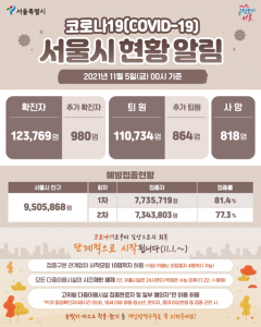 #코로나19 서울시 현황(11.5. 00시 기준) ✔국내 375,464번째 확진자 발생 ✔서울시 확진자 현황: 123,769명(전일대비+980) 🔎서울시 코로나19 통합 사이트: http://seoul.go.kr/coronaV/coronaStatus.do?sns=fb 🔎백신 예방접종 […]