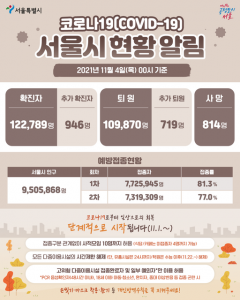 #코로나19 서울시 현황(11.4. 00시 기준) ✔국내 373,120번째 확진자 발생 ✔서울시 확진자 현황: 122,789명(전일대비+946) 🔎서울시 코로나19 통합 사이트: http://seoul.go.kr/coronaV/coronaStatus.do?sns=fb 🔎백신 예방접종 […]