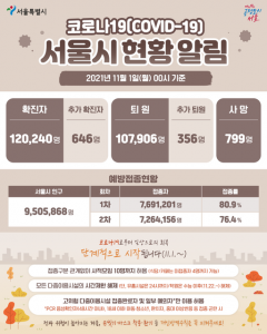 #코로나19 서울시 현황(11.1. 00시 기준) ✔국내 366,386번째 확진자 발생 ✔서울시 확진자 현황: 120,240명(전일대비+646) 🔎서울시 코로나19 통합 사이트: http://seoul.go.kr/coronaV/coronaStatus.do?sns=fb 🔎백신 예방접종 […]
