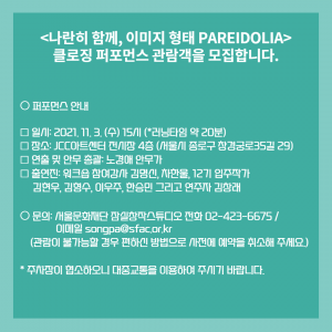 [사전예약 안내] <나란히 함께, 이미지 형태 PAREIDOLIA> 클로징 퍼포먼스 ⠀⠀⠀⠀⠀⠀⠀⠀⠀⠀ 2021 잠실창작스튜디오 12기 입주작가 기획전시 <나란히 함께, 이미지 형태 PAREIDOLIA>가 […]
